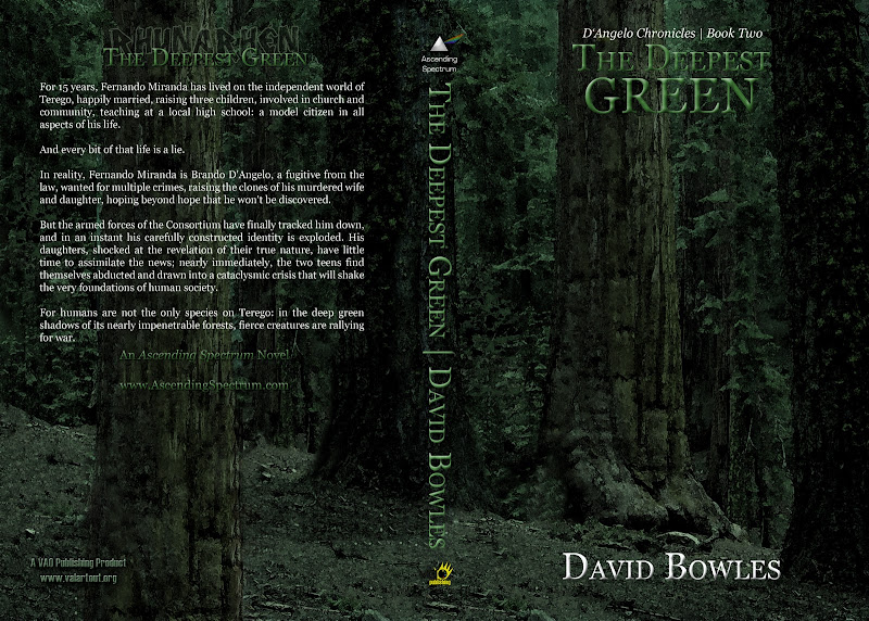 Okay, not horrible, imo. The second volume, The Deepest Green, was a little trickier. Most of the story takes place deep in the heart of an alien forest, with trees that dwarf sequoias and pretty intense-looking aliens. Well, I wasn't going to draw the aliens (my daughter Charlene had, but in a manga-like style that wouldn't have worked for a book cover), so I got my hands on a royalty-free photo of some redwoods, applied a green filter, and used artistic filters to make the forest look painted. But this image would only work for the front of the book, and I needed a wrap-around. So I grabbed a tree that was cut off at the far right of the picture, copied it, and pasted it against a similar tree cut off on the left, and then I used the healing tool to make it look like a single tree. Then I grabbed the middle tree and copied it to the left of this, stretched it out so that it appeared to be rooted off screen, and used the clone stamp and healing brush to clean up. I copied bits of ground and background foliage from the front to the back, did some more cloning and healing, and voila! I then adjusted the color overlay of the text styles from Blue, typed in what I needed to, added the VAO Publishing logo, and I was pretty much done.