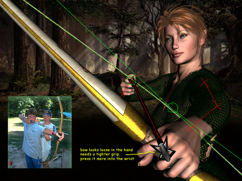 first of all, i am asuming shes supposed to aim at something? shes standing very relaxed and isnt really threatening, atm. anyway, if shes supposed to be threatening, her arms need to be strechted more, and the arrow hand prolly closer to the body/face. the bow hand prolly needs a tighter grip since the bow would be pressed into the wrist when pulling back the bow string, and the thumb should go around it and not stand away like that.