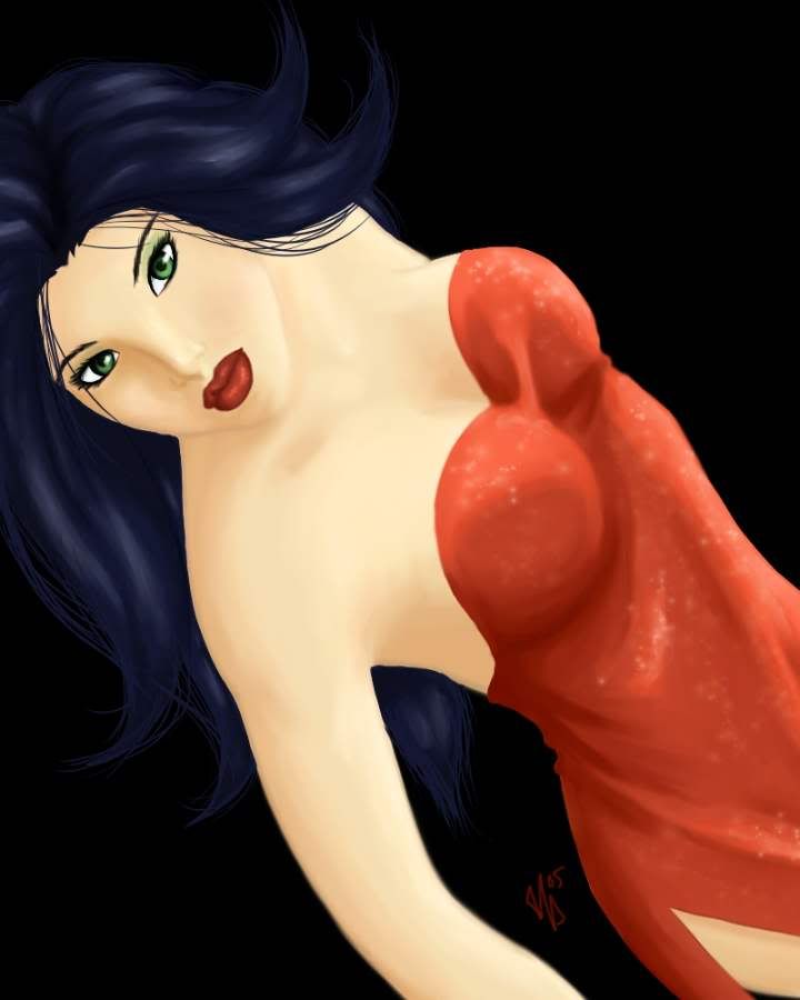 something about the face that contrasts with the dress... too smooth maybe. maybe dirty her up some. add a herpie or two
