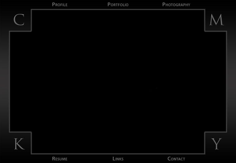 I want to keep the corner (ie scattered) letters for visual ambiguity. It conventionally spells out CMKY, but a clockwise eyeflow will reveal CMYK. A sense of contrast which I hope to constantly convey throughout the website, especially since monitors typically deal with RGB (as opposed to CMYK for prints).