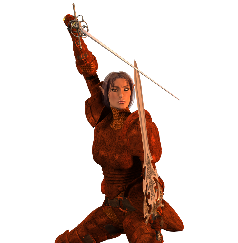 first off.. awesome morph! I look at that and instantly think EQ, either half elf or wood elf. I would suggest going in to her neck and manually reapplying her skin texture. That chainmail has always bothered me being so high up on V3's neck, it makes her look like a giraffe IMO =/ The pose, armor etc all look good. Doesn't quite say bard but I'm sure any spell effects you add will do that. The lighting helps give it a very monotone feel which is nice but maybe try a couple spots along one side or on her face for more drama? It's hard to suggest lighting without knowing what kind of background/scene you're going for. Also.. maybe play with the shine and reflection of the swords and such? They seem kind of flat. Unless of course you intend to post that =)