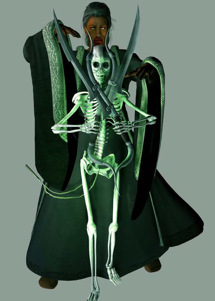 Ok...here is Necro with pet...gonna render them separately so I can fiddle with them n spell effects n stuff...just did this to show Laz...he's really happy with it...although I think the skelly takes too much focus from him and the hair is horrid...looks like Little Richard...but he LOOOOVES it and I am not allowed to change it now....lmao....oh well...anyways...